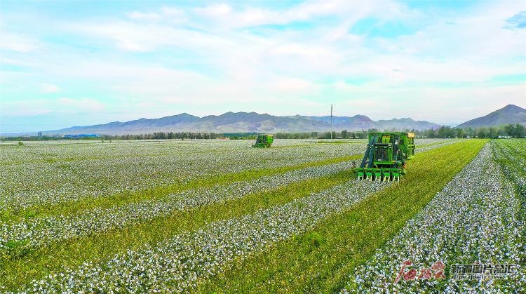 9月23日,采棉機(jī)在呼圖壁縣大豐鎮(zhèn)紅山村棉田采收新棉。眼下,呼圖壁縣70萬畝棉花吐絮,大型采棉機(jī)在棉田里穿梭作業(yè),一派繁忙景象。