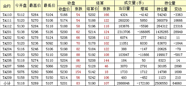 主力TA201合約當日交易走勢