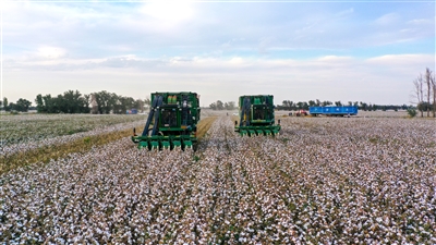 時下,呼圖壁縣70萬畝棉花競相吐絮,一派豐收景象。9月23日,在呼圖壁縣大豐鎮(zhèn)紅山村棉田里,采棉機正在采收棉花。