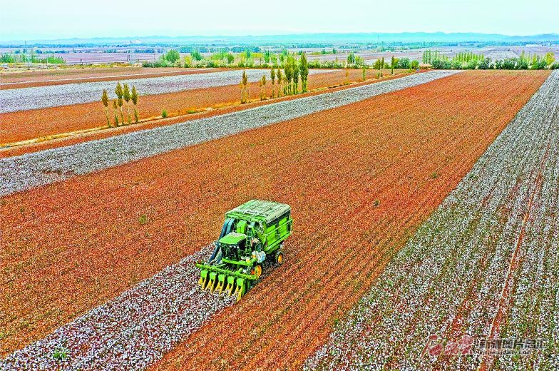 10月4日,采棉機(jī)在采收棉花。眼下,新疆生產(chǎn)建設(shè)兵團(tuán)第五師雙河市77萬畝棉花迎來采收季。