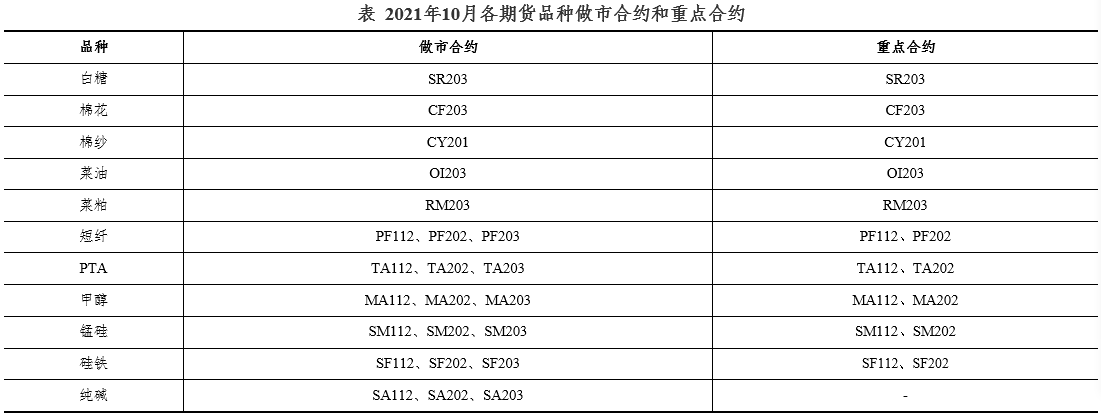 表2021年10月各期貨品種做市合約和重點(diǎn)合約