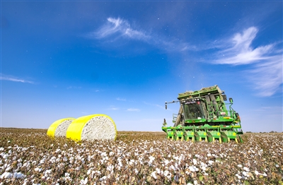 10月3日,瑪納斯縣北五岔鎮(zhèn)荒工地村棉田,自走式打包采棉機(jī)正在作業(yè)。