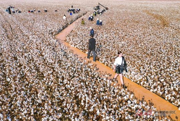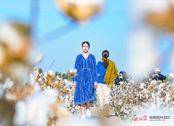 10月10日,在昌吉國(guó)家農(nóng)業(yè)科技園區(qū)現(xiàn)代農(nóng)業(yè)示范園的棉田里舉行一場(chǎng)綠色棉田秀活動(dòng)。模特們身穿以新疆高品質(zhì)棉花為原料制成的服裝走秀,展示新疆高品質(zhì)棉產(chǎn)品的獨(dú)特魅力。