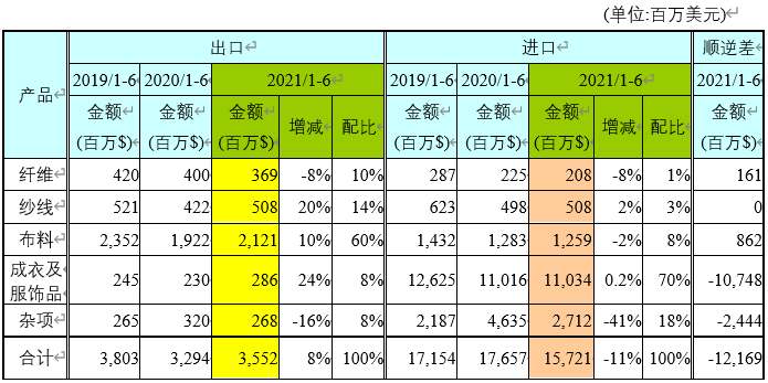 表一 2021年1-6月日本紡織品及成衣出、進口金額