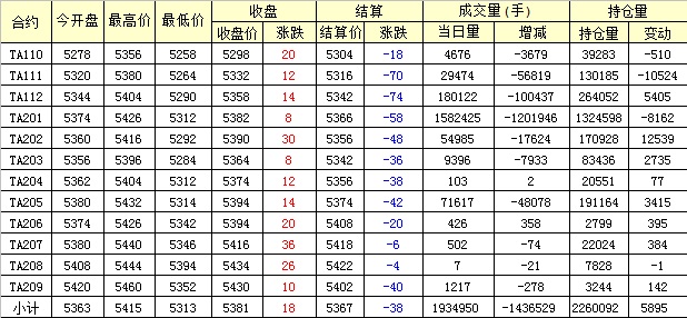 主力TA201合約當日交易走勢