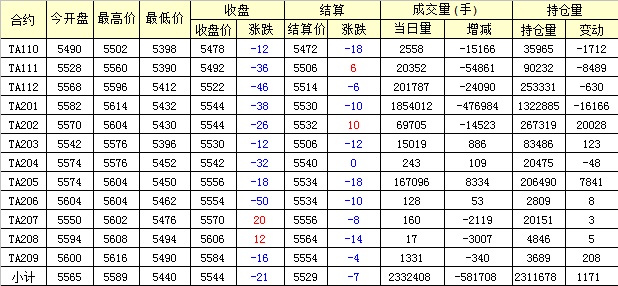 主力TA201合約當日交易走勢