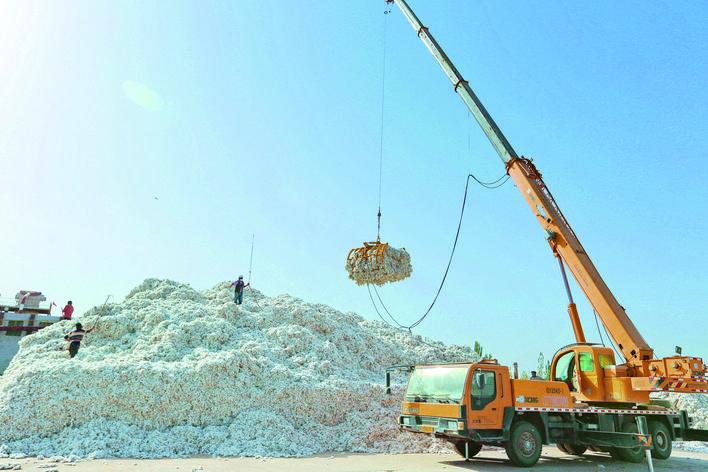 10月18日,庫(kù)車銀花棉業(yè)有限責(zé)任公司工人整理剛收購(gòu)的新棉。