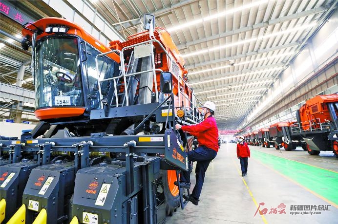 10月20日,位于烏魯木齊經(jīng)濟(jì)技術(shù)開(kāi)發(fā)區(qū)(頭屯河區(qū))的鐵建重工新疆有限公司,工人在對(duì)組裝好的采棉機(jī)進(jìn)行檢查。