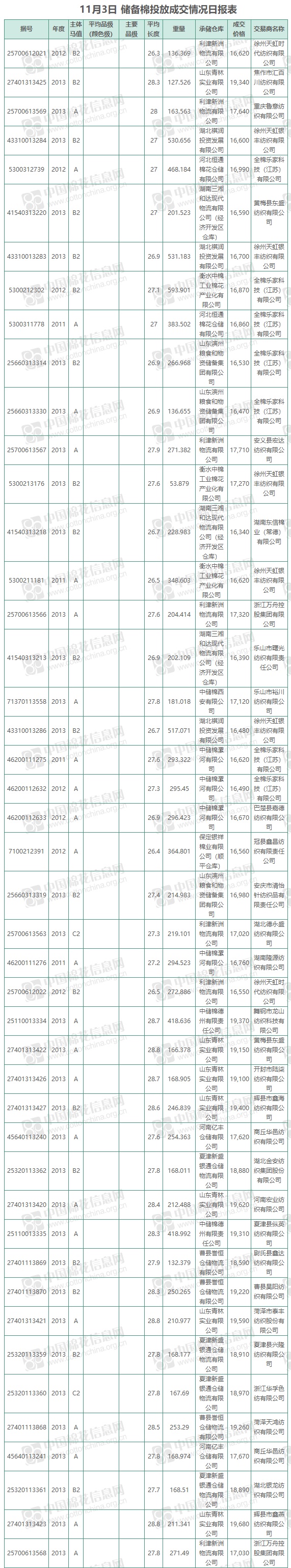 11月3日儲備棉投放銷售資源30002.009噸,實(shí)際成交11856.683噸,成交率39.52%,成交均價(jià)17532元/噸,較2日下跌214元/噸,折3128價(jià)格19264元/噸,較2日下跌389元/噸?!?/p>