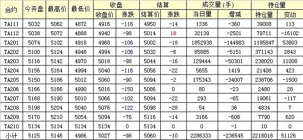 主力TA201合約當日交易走勢