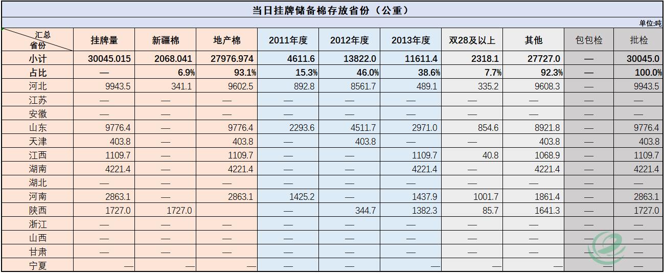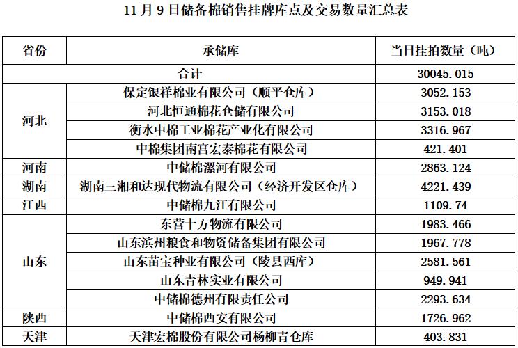 中國儲備棉管理有限公司定于11月9日通過全國棉花交易市場上市銷售中央儲備棉重量30045.015噸,共107捆。具體庫點及數(shù)量見下表。