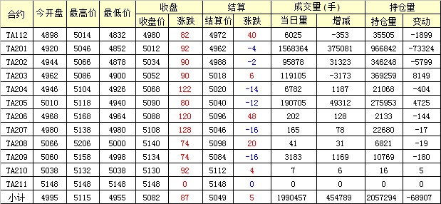 主力TA201合約當日交易走勢