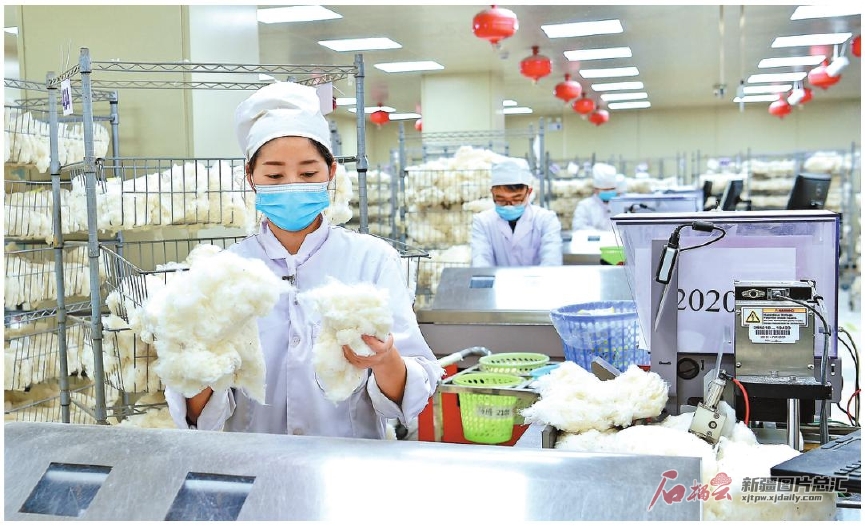 11月18日,位于阿拉爾經(jīng)濟(jì)技術(shù)開發(fā)區(qū)紡織工業(yè)城的第一師棉花中心儲備庫,工作人員在檢驗新棉。近年來,兵團(tuán)第一師阿拉爾市樹立全產(chǎn)業(yè)鏈發(fā)展思路,優(yōu)化棉花產(chǎn)業(yè)布局,建成集紡紗、織布、印染、服裝等為一體的綜合紡織工業(yè)城。