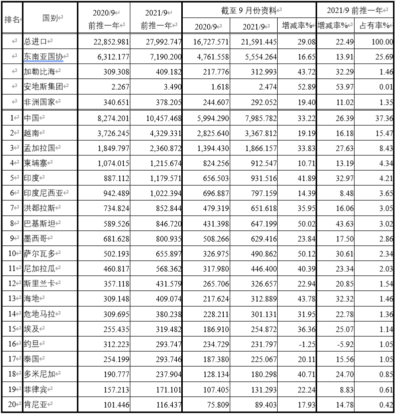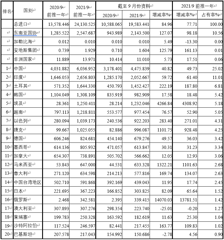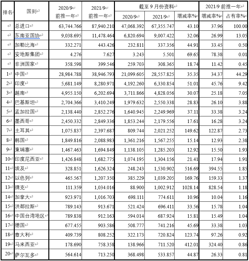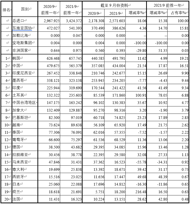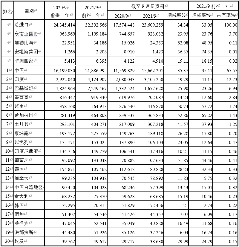 注:依2021年9月前推一年進(jìn)口占有率排序