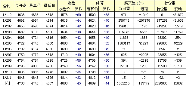 主力TA201合約當日交易走勢