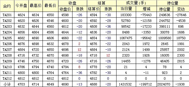 主力TA201合約當日交易走勢
