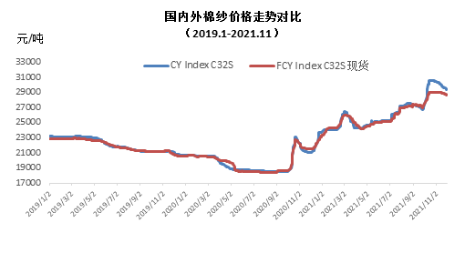 本月內(nèi)外棉紗價格有所分化,國內(nèi)下跌而進口紗略有上漲。國產(chǎn)32支純棉紗11月均價29964元/噸,較上月下跌262元,跌幅0.87%,較去年同期上漲8621元,漲幅40.39%;進口32支純棉紗11月均價28899元/噸,較上月上漲51元,漲幅0.18%,較去年同期上漲7203元,漲幅33.2%。