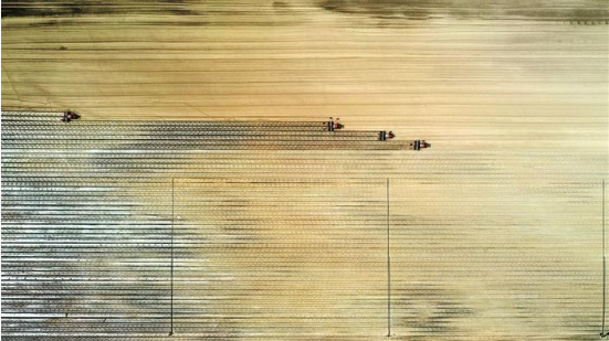 4月2日,三師五〇團(tuán)職工使用北斗導(dǎo)航無人駕駛播種機(jī)播種棉花。今年,三師計(jì)劃種植棉花113萬畝,大面積采用“干播濕出”種植技術(shù),用水量只有傳統(tǒng)播種方式的20%。