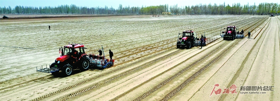 4月2日,新疆生產(chǎn)建設(shè)兵團(tuán)第三師50團(tuán)職工利用北斗導(dǎo)航無(wú)人駕駛拖拉機(jī)播種棉花(無(wú)人機(jī)拍攝)。今年該師計(jì)劃播種棉花113萬(wàn)畝,其中大面積使用北斗導(dǎo)航無(wú)人駕駛技術(shù)播種棉花。