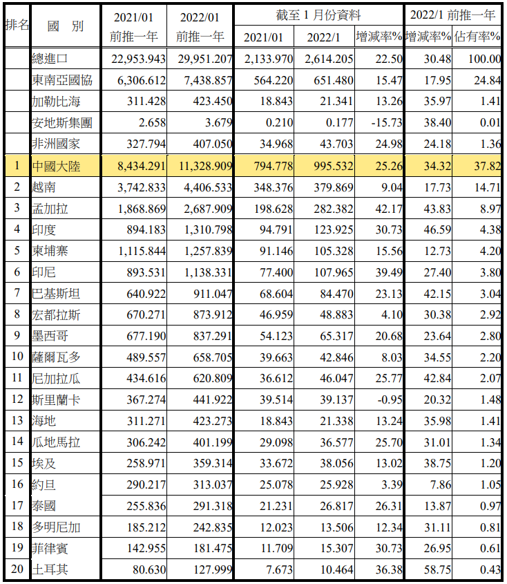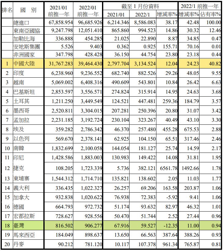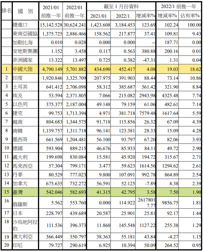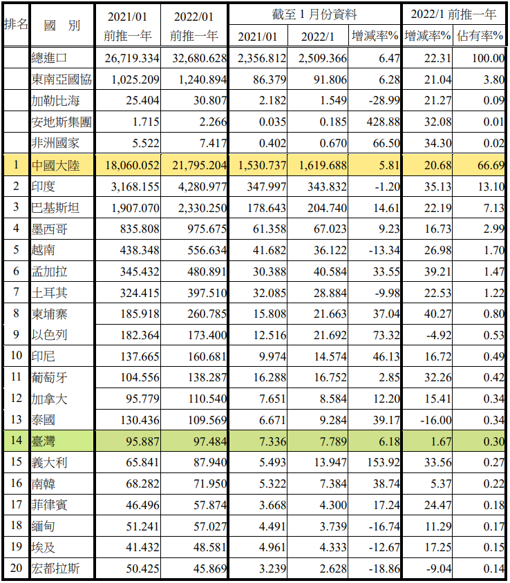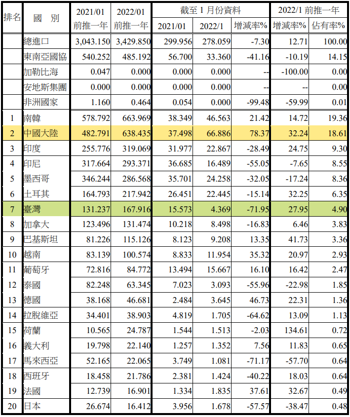 注:依2022年1月前推一年進(jìn)口占有率排序