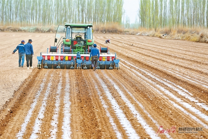 4月3日,棉農在庫車市牙哈鎮(zhèn)晨光村棉田種植棉花。目前,庫車市164.4萬畝棉花播種工作全面展開,田間地頭一派繁忙的春播景象。