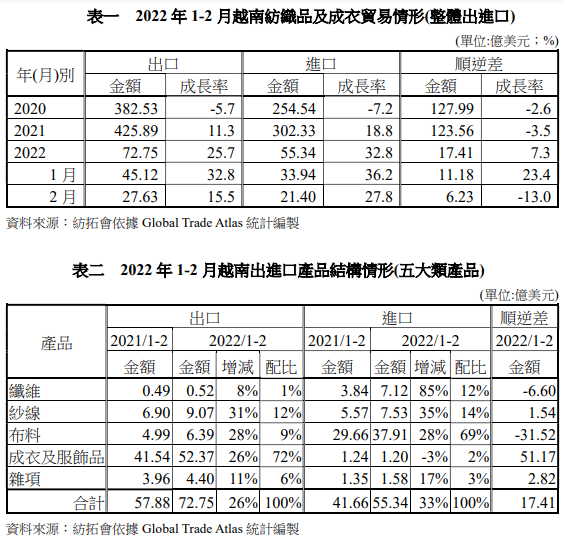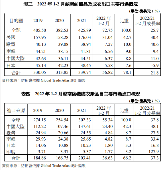 2022年1-2月紡織品及成衣出口總值達72.8億美元,較前一年度同期成長25.7%,主要出口項目為成衣產(chǎn)品,出口值52.4億美元,占總出口值72%;其次為紗線產(chǎn)品,出口值9.1億美元,占總出口值12%。各項產(chǎn)品出口值均較上年同期成長,其中成長最多者為紗線產(chǎn)品,計成長31%,成衣及服飾則成長26%。(詳表一、表二)