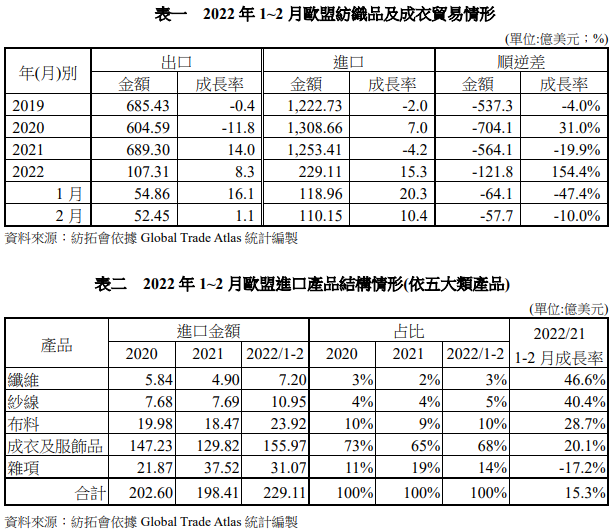 2022年1-2月歐盟紡織品及成衣出口總值107.31億美元,較上年同期成長8.3%,進口總值229.11億美元,成長15.3%,貿(mào)易逆差121.8億美元。主要進口項目為成衣,進口值155.97億美元,占總進口值68%,較上年同期成長20.1%。(詳表一、表二)