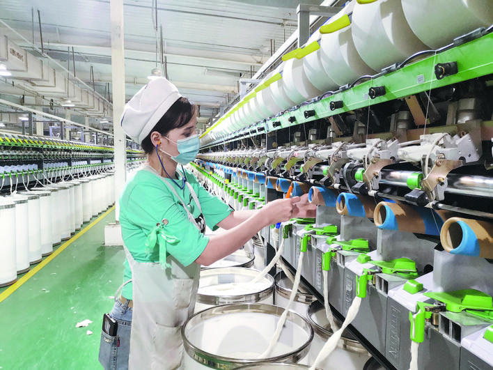 5月6日,在阿瓦提縣幸福創(chuàng)業(yè)園,阿克蘇普美紡織有限公司工人在紡織車(chē)間作業(yè)。當(dāng)前,該公司正開(kāi)足馬力生產(chǎn),確保1200噸紡紗訂單按時(shí)完成。
