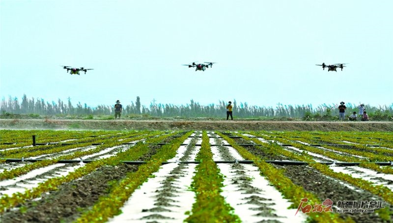 5月11日,技術(shù)員操作無人機(jī)在庫爾勒市哈拉玉宮鄉(xiāng)一處棉田噴灑防蟲害藥物。目前,巴音郭楞蒙古自治州300余萬畝棉花陸續(xù)進(jìn)入幼苗管護(hù)期,棉農(nóng)搶抓農(nóng)時對棉田開展田間管理。