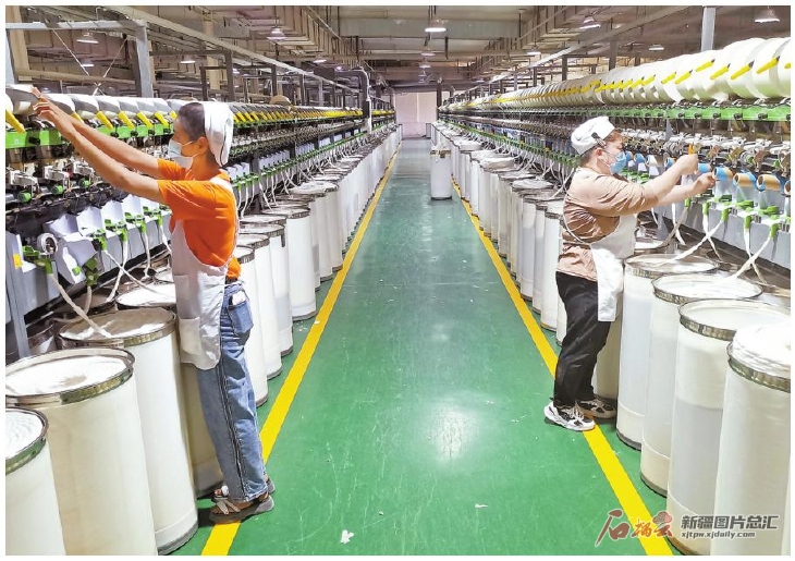 5月16日,在阿瓦提縣幸福創(chuàng)業(yè)園,阿克蘇普美紡織科技有限公司工人在紡織車間作業(yè)。當(dāng)前,該公司正開足馬力生產(chǎn),確保1200噸紡紗訂單按時完成。