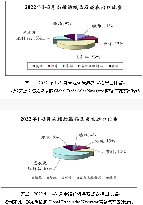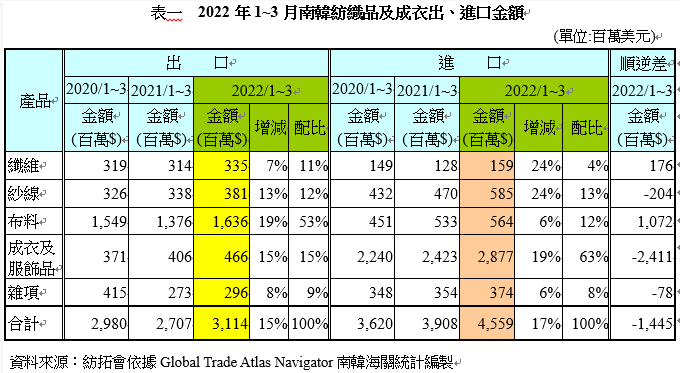 2022年1-3月紡織品及成衣進(jìn)口總值45.6億美元,較上年同期成長(zhǎng)17%,主要進(jìn)口項(xiàng)目為成衣及服飾品,進(jìn)口值28.8億,占總進(jìn)口值63%。各項(xiàng)產(chǎn)品進(jìn)口值均較上年同期成長(zhǎng),其中成長(zhǎng)最多者為纖維及紗線產(chǎn)品,各成長(zhǎng)24%;進(jìn)口大宗的成衣及服飾品則成長(zhǎng)19%。(詳表一、圖二)