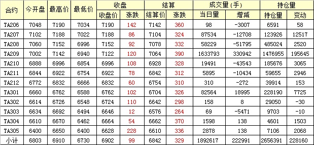 主力TA209合約當日交易走勢
