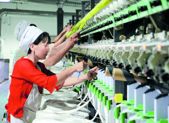 7月13日,工人在位于阿瓦提縣幸福創(chuàng)業(yè)園的阿克蘇普美紡織科技有限公司紡織車間作業(yè)。目前,該公司正開足馬力生產(chǎn),確保2400噸紡紗訂單按時(shí)完成。