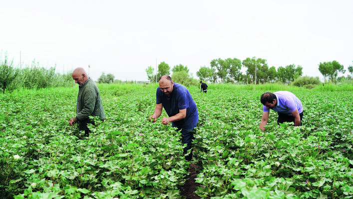 7月17日,在柯坪縣阿恰勒鎮(zhèn)庫木魯克村的棉田里,棉農力提普·熱克普在縣農業(yè)技術推廣中心技術員的指導下,一邊給棉花打頂,一邊聆聽技術人員講解棉花病蟲害防治要領。