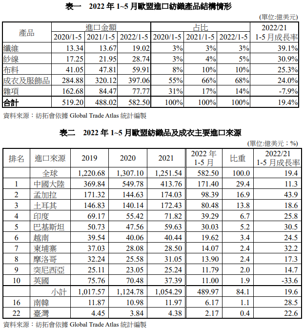 2022年1-5月歐盟紡織品及成衣進(jìn)口總值582.5億美元,較上年同期成長19.4%。主要進(jìn)口項(xiàng)目為成衣,進(jìn)口值397.06億美元,占總進(jìn)口值68%,成長24%。(詳表一)