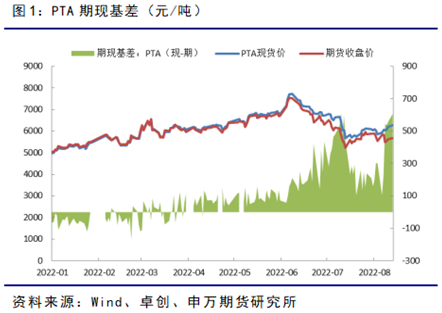 PTA近月偏強(qiáng)主要原因,在于7-8月國(guó)內(nèi)PTA開工負(fù)荷大幅下滑,檢修及停產(chǎn)裝置較多,市場(chǎng)上現(xiàn)貨偏緊,帶來(lái)現(xiàn)貨基差及近月價(jià)格的持續(xù)走強(qiáng)。8月16日,PTA華東地區(qū)現(xiàn)貨報(bào)價(jià)在6270左右,升水期貨09合約330元左右,對(duì)PTA2301主力合約升水則超過(guò)700元,現(xiàn)貨基差刷新近3年的高位水平。
