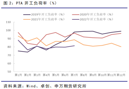 2022年上半年,國(guó)內(nèi)PTA月度開工負(fù)荷普遍不高。3季度的7月開工略有提升,但隨著PTA大廠檢修停產(chǎn)的影響,8月上旬,PTA日度開工率多數(shù)時(shí)間僅維持在不足70%的低位水平。主要原因依然在于淡季消費(fèi)訂單不足,下游聚酯工廠聯(lián)合減產(chǎn)后,需求表現(xiàn)持續(xù)疲弱,PTA大廠也集中檢修降負(fù)荷,短期內(nèi)帶來(lái)了現(xiàn)貨供應(yīng)緊張的局面。