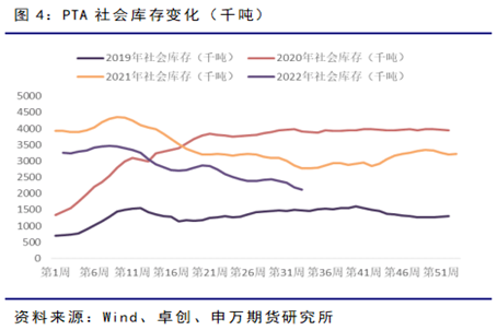 由于今年國(guó)內(nèi)PTA開工負(fù)荷普遍不高,8月份PTA出現(xiàn)連續(xù)去庫(kù)現(xiàn)象。截至8月11日,國(guó)內(nèi)PTA周度社會(huì)庫(kù)存211萬(wàn)噸,延續(xù)去庫(kù)狀態(tài)。在淡季背景下,PTA的連續(xù)去庫(kù)也帶來(lái)對(duì)近月價(jià)格的較強(qiáng)支撐。隨著PTA裝置后續(xù)的重啟和提負(fù)荷,PTA的去庫(kù)或被打斷,在下游聚酯需求未明顯回升之前,PTA或再度轉(zhuǎn)為壘庫(kù)狀態(tài)。