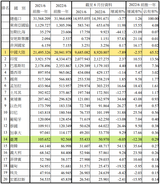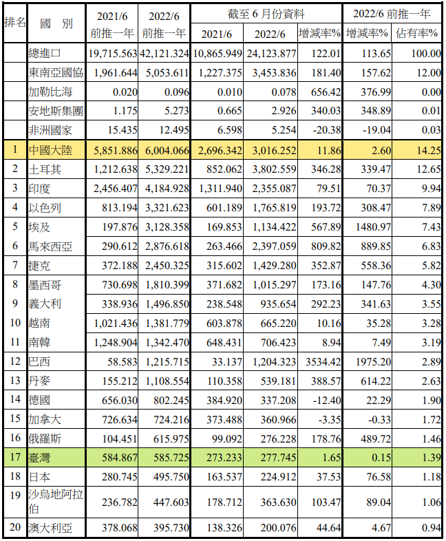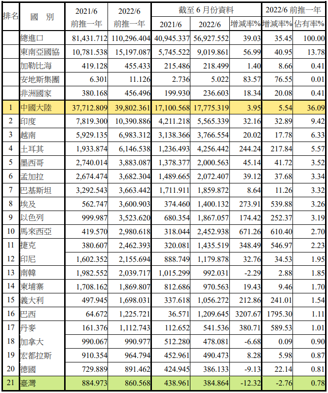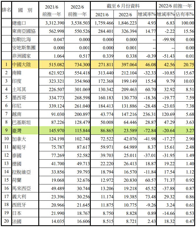 注:依2022年6月前推一年進(jìn)口占有率排序