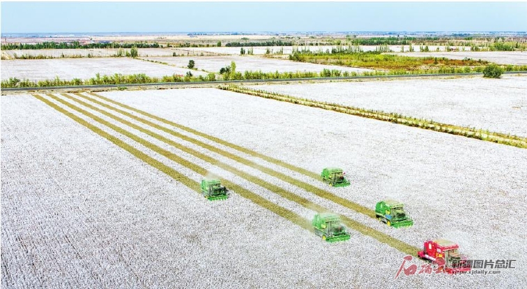 10月7日,在昌吉國家農(nóng)業(yè)高新技術(shù)產(chǎn)業(yè)示范區(qū)優(yōu)質(zhì)棉種植基地,裝有北斗導(dǎo)航系統(tǒng)的采棉機(jī)在棉田作業(yè)。目前,該示范區(qū)種植的10萬畝優(yōu)質(zhì)棉已采收3萬余畝。