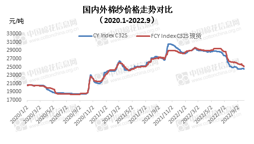 本月內(nèi)外棉紗價格均繼續(xù)下跌,國產(chǎn)32支純棉紗9月均價24536元/噸,較上月下跌405元,跌幅1.62%,較去年同期下跌2541元,跌幅9.38%;進口32支純棉紗9月均價25556元/噸,較上月下跌569元,跌幅2.18%,較去年同期下跌1702元,跌幅6.24%。