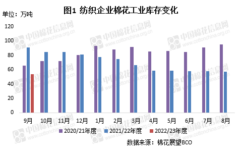 本月,受新疆疫情影響,出疆棉花運輸受限,內(nèi)地庫棉價居高不下,且資源量較有限,紡織廠仍以隨用隨買為主,原料庫存繼續(xù)下降。截至9月30日,紡織廠在庫棉花工業(yè)庫存量為53.56萬噸,較上月底減少3.76萬噸,同比減少37.86萬噸。其中36%企業(yè)減少棉花庫存,22%增加庫存,47%基本保持不變。