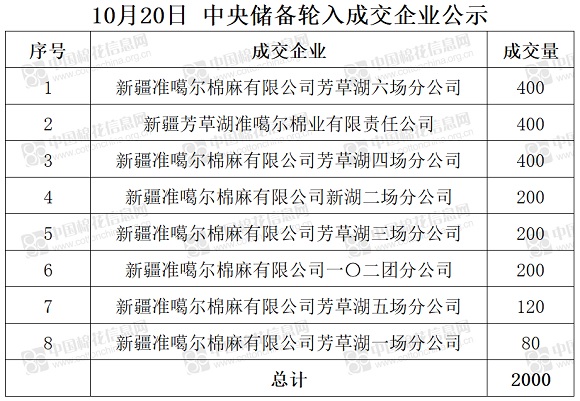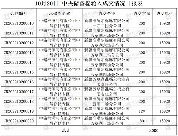 10月20日,中國儲(chǔ)備棉管理有限公司掛牌采購棉花6000噸(公定重量),實(shí)際成交2000噸,成交率33%,成交均價(jià)15920元/噸,成交最高價(jià)15920元/噸,成交最低價(jià)15920元/噸。