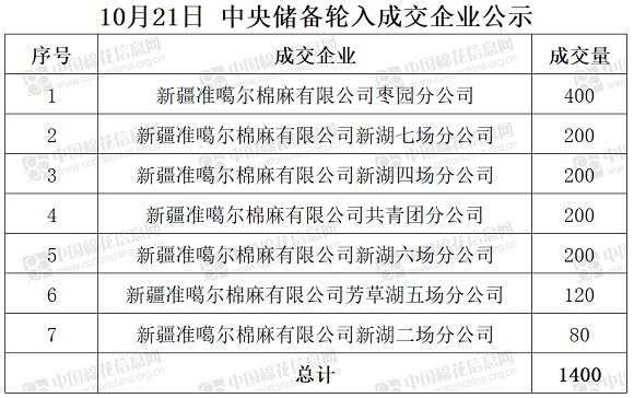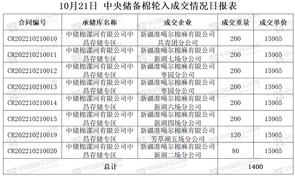 10月21日,中國(guó)儲(chǔ)備棉管理有限公司掛牌采購(gòu)棉花6000噸(公定重量),實(shí)際成交1400噸,成交率23%,成交均價(jià)15905元/噸,成交最高價(jià)15905元/噸,成交最低價(jià)15905元/噸。