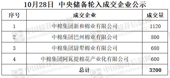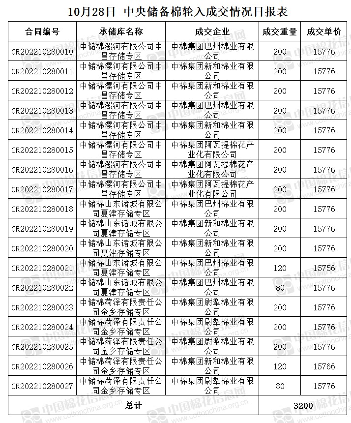 10月28日,中國儲備棉管理有限公司掛牌采購棉花6000噸(公定重量),實(shí)際成交3200噸,成交率53%,成交均價15775元/噸,成交最高價15776元/噸,成交最低價15756元/噸。