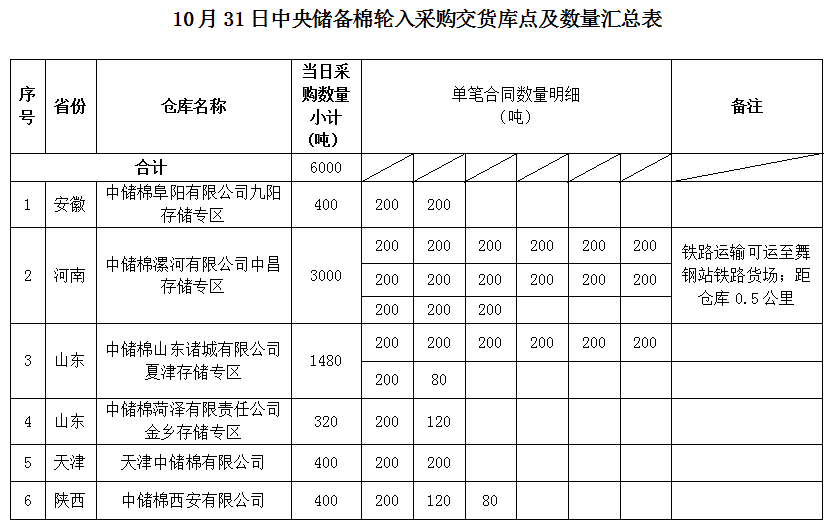 中國儲(chǔ)備棉管理有限公司定于2022年10月31日采購棉花6000噸(公定重量)。具體庫點(diǎn)及數(shù)量如下: