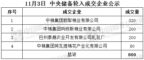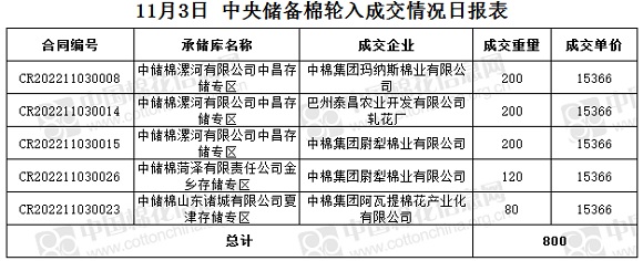 11月3日,中國(guó)儲(chǔ)備棉管理有限公司掛牌采購(gòu)棉花6000噸(公定重量),實(shí)際成交800噸,成交率13%,成交均價(jià)15366元/噸,成交最高價(jià)15366元/噸,成交最低價(jià)15366元/噸。