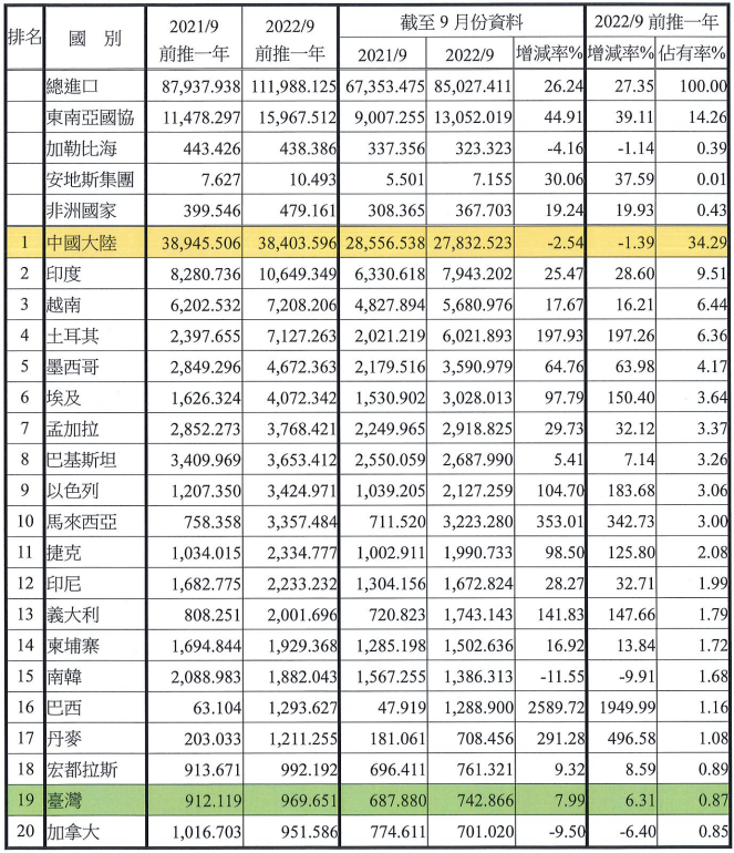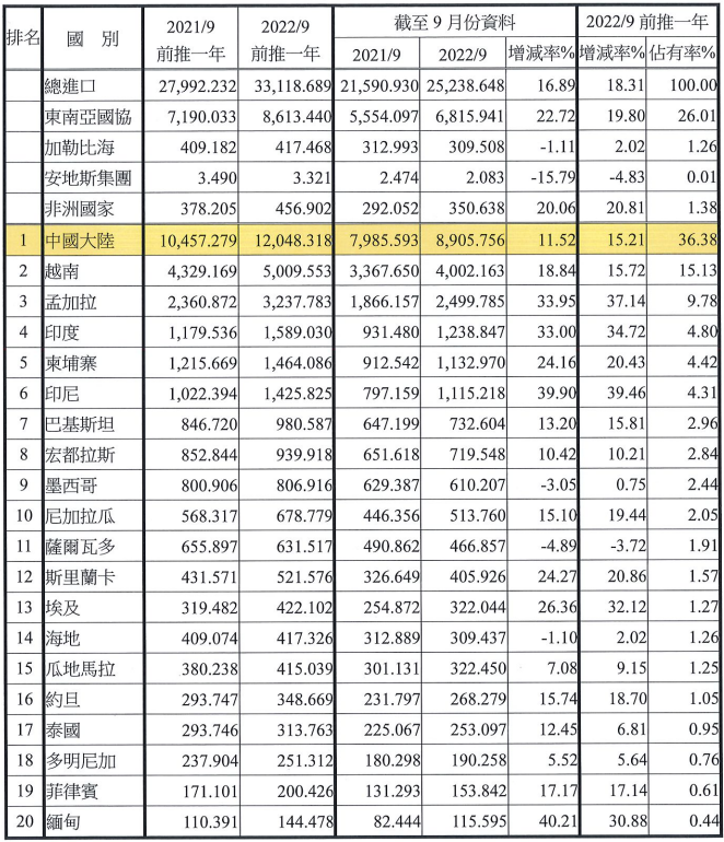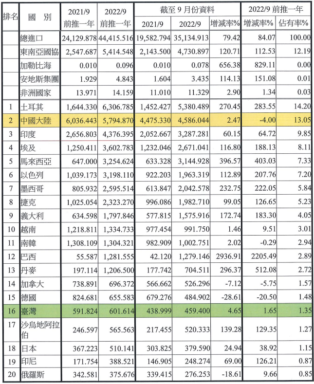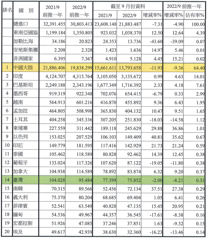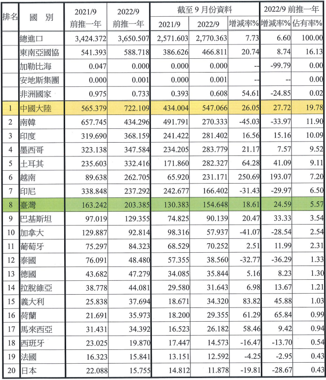 注:依2022年9月前推一年進口占有率排序