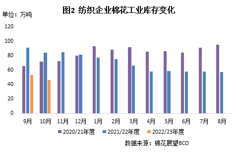 本月棉花出疆發(fā)運(yùn)仍然困難,內(nèi)地的新疆棉價(jià)格堅(jiān)挺,同時(shí)終端需求不佳,紡織企業(yè)原料采購仍以剛需為主,庫存繼續(xù)下降。截至10月31日,紡織企業(yè)在庫棉花工業(yè)庫存量為46.51萬噸,較上月底減少7.05萬噸,同比減少37.94萬噸。其中:39%的企業(yè)減少棉花庫存,23%增加庫存,39%基本保持不變。
