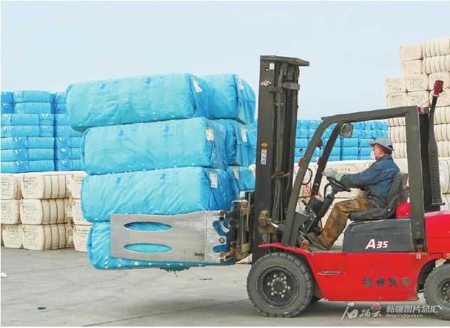 11月21日,工人在哈密市供銷農(nóng)業(yè)有限公司棉監(jiān)管庫進(jìn)行棉包入庫作業(yè)。連日來,哈密市棉花收購、加工、入庫等工作全面展開。